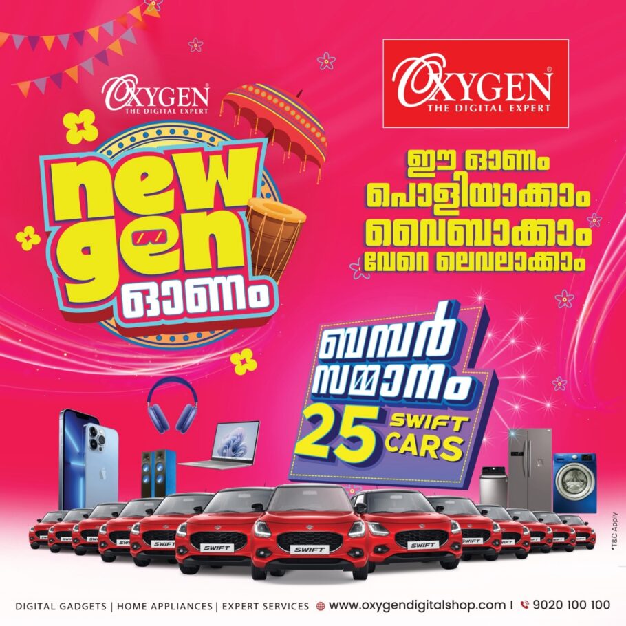 Kochi: Oxygen, South India’s leading electronics, home appliances, and digital gadgets retailer, has launched its New Gen Onam sale with unbeatable discounts and exciting offers. Celebrating its 25th anniversary and the Onam festival, Oxygen is giving away 25 Swift cars as bumper prizes to lucky customers through a draw.